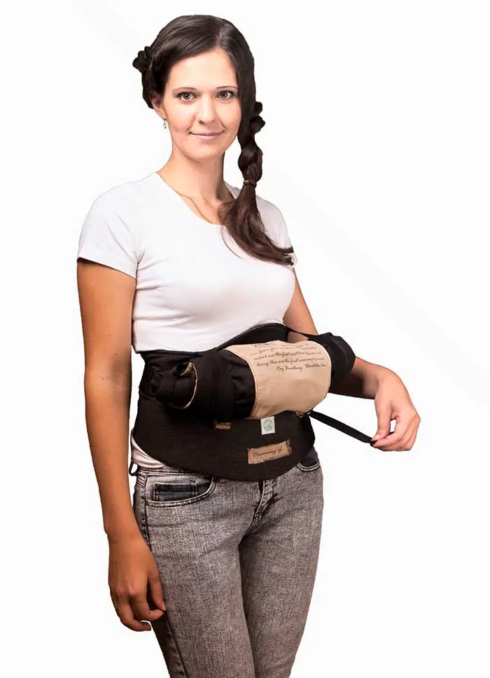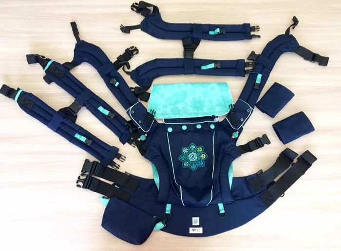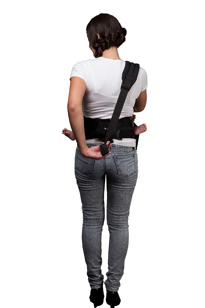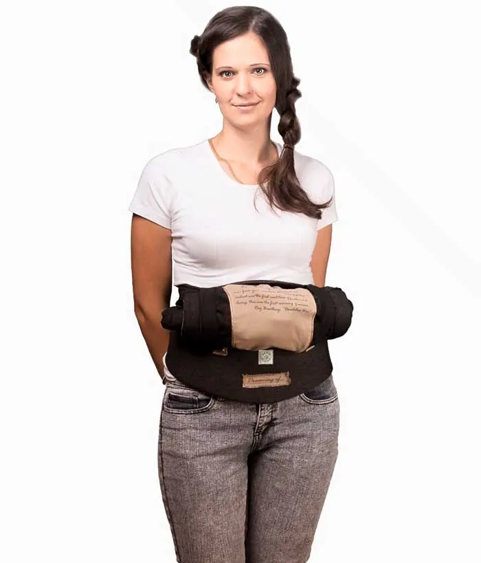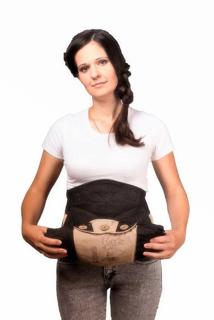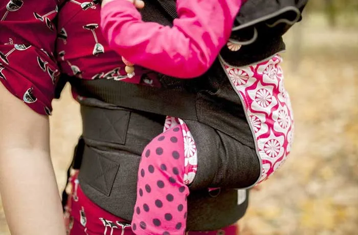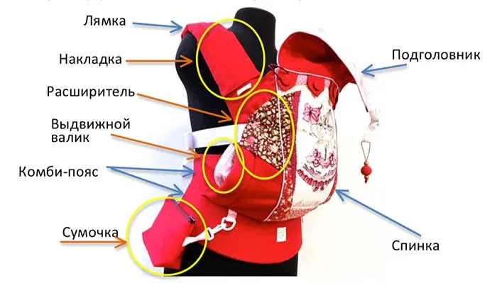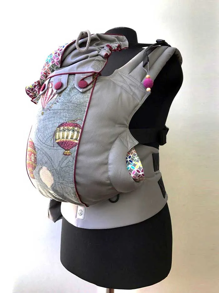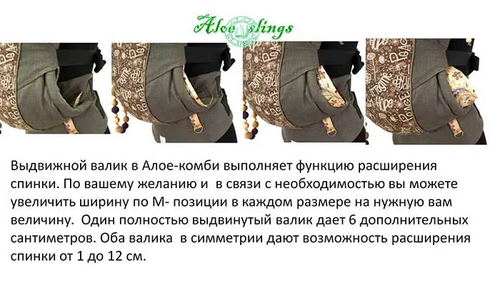Подвижные эластичные валики (длинные пришитые к поясу и спинке трапециевидные детали) должны лежать как часть спинки, ножки ребенка укладываются прямо на них. По мере роста бедра ребенка у вас появиться возможность выдвигать валики до подколеночек для сохранения М-позиции положения ножек.