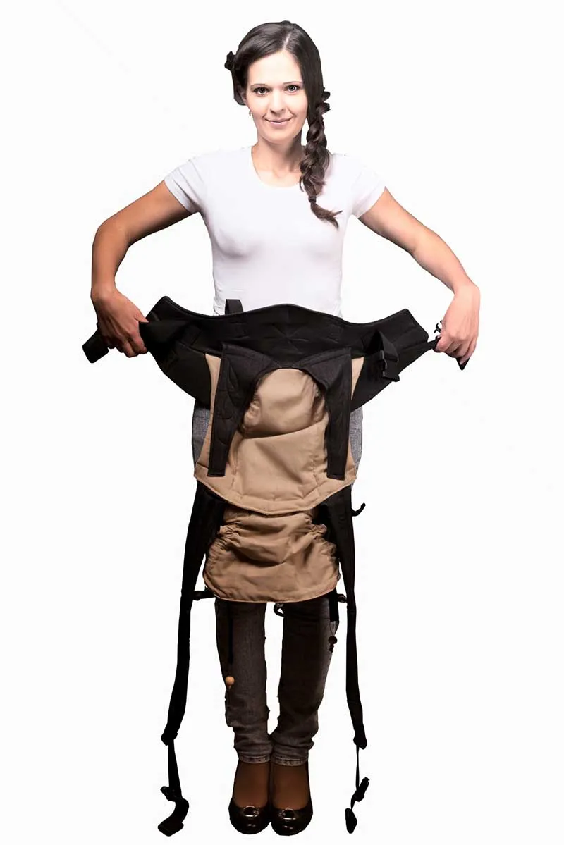 Рюкзачок можно носить на талии, а так же ниже. Ходунков удобнее носить, надевая пояс ближе к бедрам. Если вам нужно чтобы ребенок мог вынимать ручки из рюкзачка сверху спинки, то можете попробовать надеть рюкзачок повыше на талии. Если вам нужно, чтобы ребенок оказался в рюкзачке поглубже, то наденьте пояс пониже.